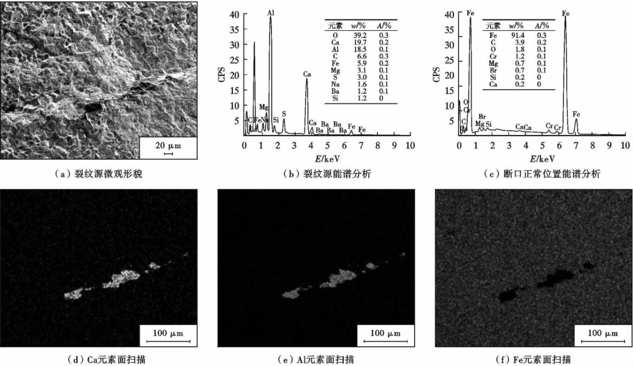 利用 ZEISS -EVO 25 扫描电镜观察图 2c 中断口裂纹源处微观形貌,见图 4a,可看出裂纹从此处向外发散,对方框区的夹杂物进行能谱分析,见图 4b 所示,能谱显示 O、Al、Ca、Mg 等元素具有较高的衍射峰。图4d、图 4e、图 4f 分别是对图 4a 区域进行 Ca、Al、Fe 元素的面扫描。